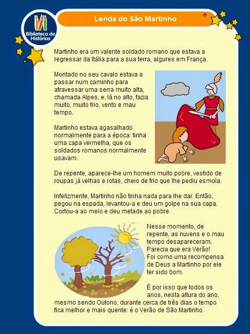 Lembro-me de ser pequenina e de ir para a escola a saltitar. Com um saco de castanhas na mão, envolvida em toda esta magia que este dia oferece. Era o Dia de São Martinho, era dia de festejar, comiam-se castanhas e revivia-se a Lenda de São Martinho, eu atentamente a ouvia, ano após ano, contado por pessoas diferentes mas sempre sem perder o seu encanto. Eu não gostava de castanhas, não gosto, nunca gostei, apreciava o dia do lado de fora, apreciava o dia pelo seu encanto, pela sua história!!